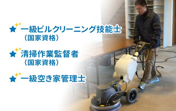 一級ビルクリーニング技能士(国家資格)が在籍していますので、安心してご依頼ください。ワンランク上の感動とサービスをご提供いたします。